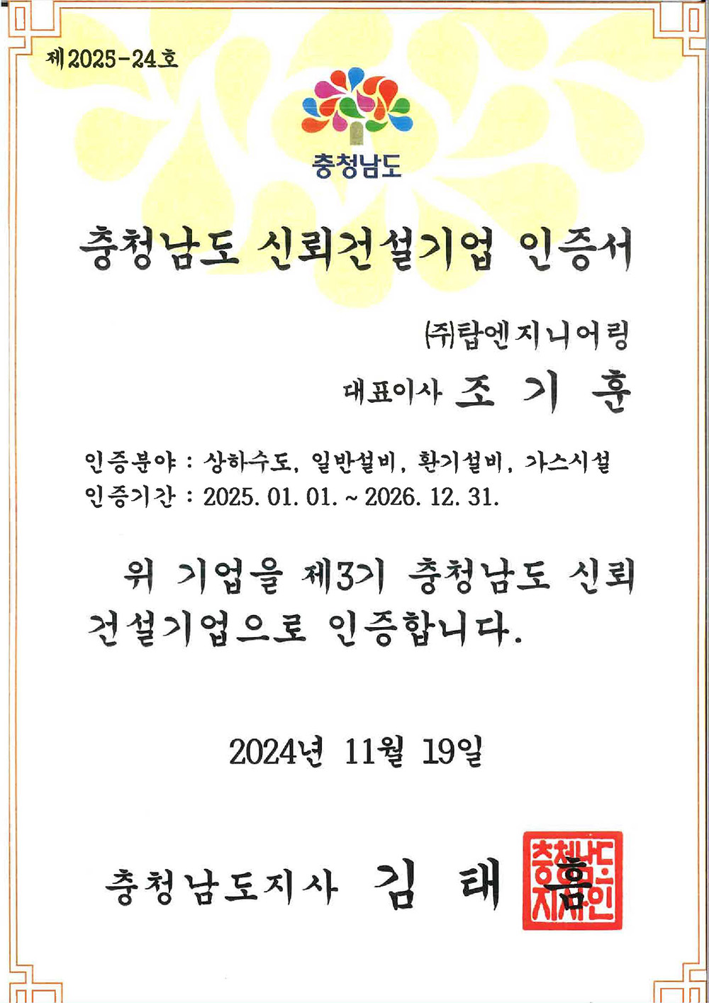 회사명 (주)탑엔지니어링 대표자명 조기훈 본사 충남 천안시 서북구 불당25로 226, 6층 625호 (골든스퀘어2) 공장 충남 아산시 음봉면 월산로 214-3 사업자 등록번호 312-86-65458
