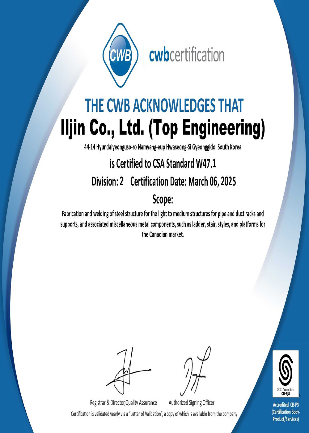 • 캐나다 CWB인증(철강 구조물의 제작 및 용접)