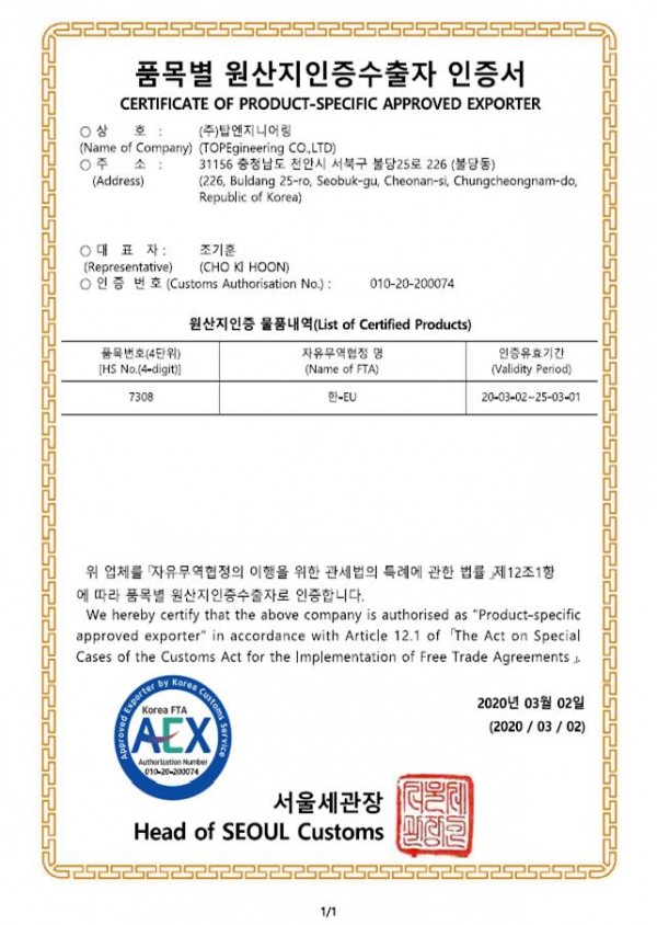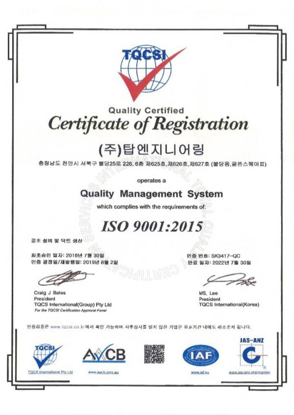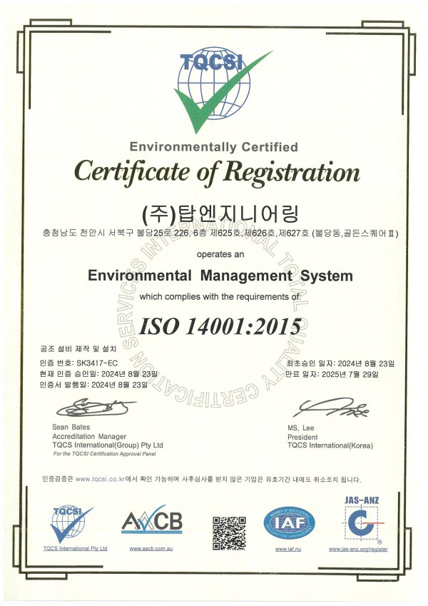 회사명 (주)탑엔지니어링 대표자명 조기훈 본사 충남 천안시 서북구 불당25로 226, 6층 625호 (골든스퀘어2) 공장 충남 아산시 음봉면 월산로 214-3 사업자 등록번호 312-86-65458